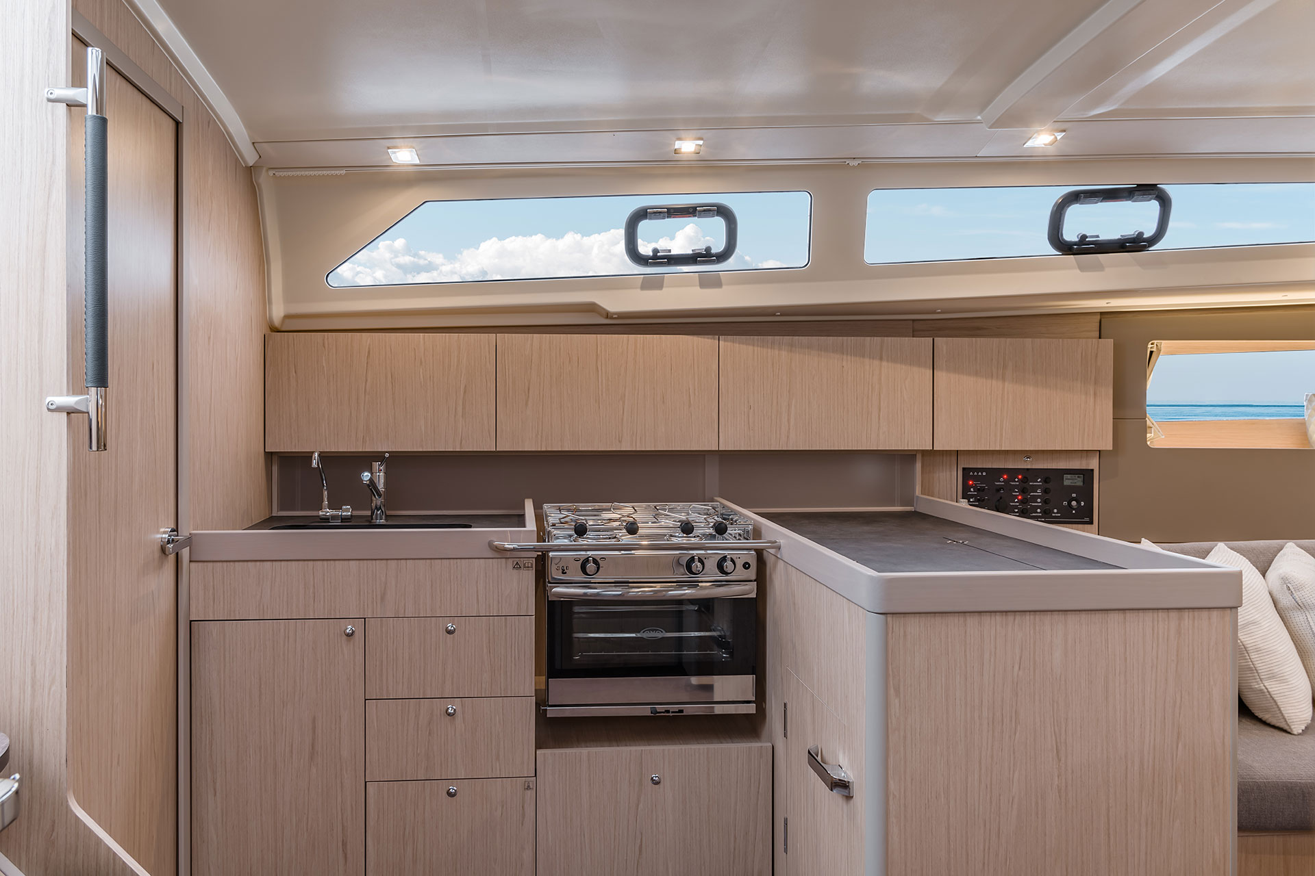 Access to the Oceanis 41.1’s harmonious interior bathed in light is by a gently sloping companionway. It offers new features in each of its four accommodation versions. In the two-cabin version, the utility room for a dishwasher and storage, as well as a large cockpit locker affording access from inside are examples of details that mark the difference.